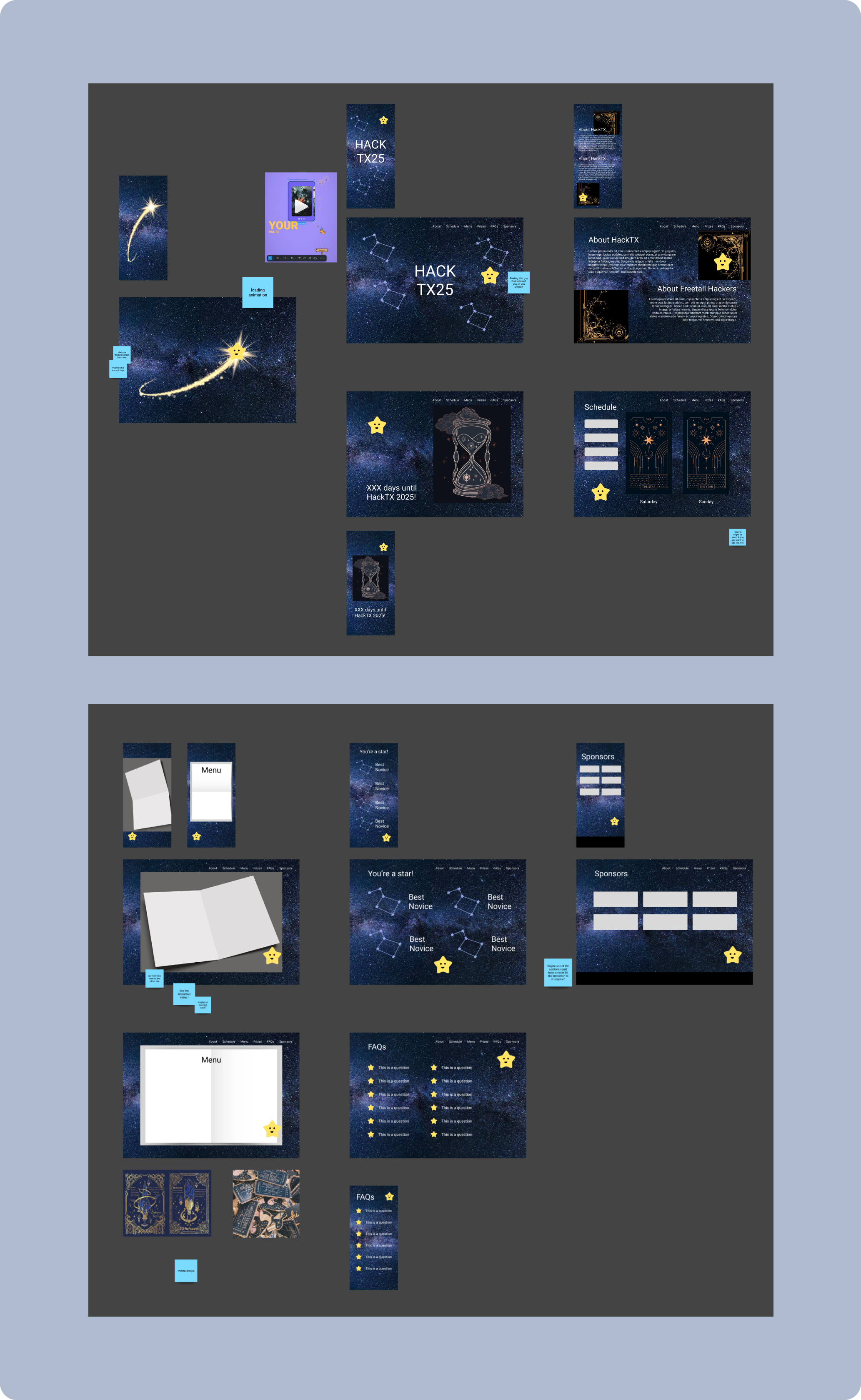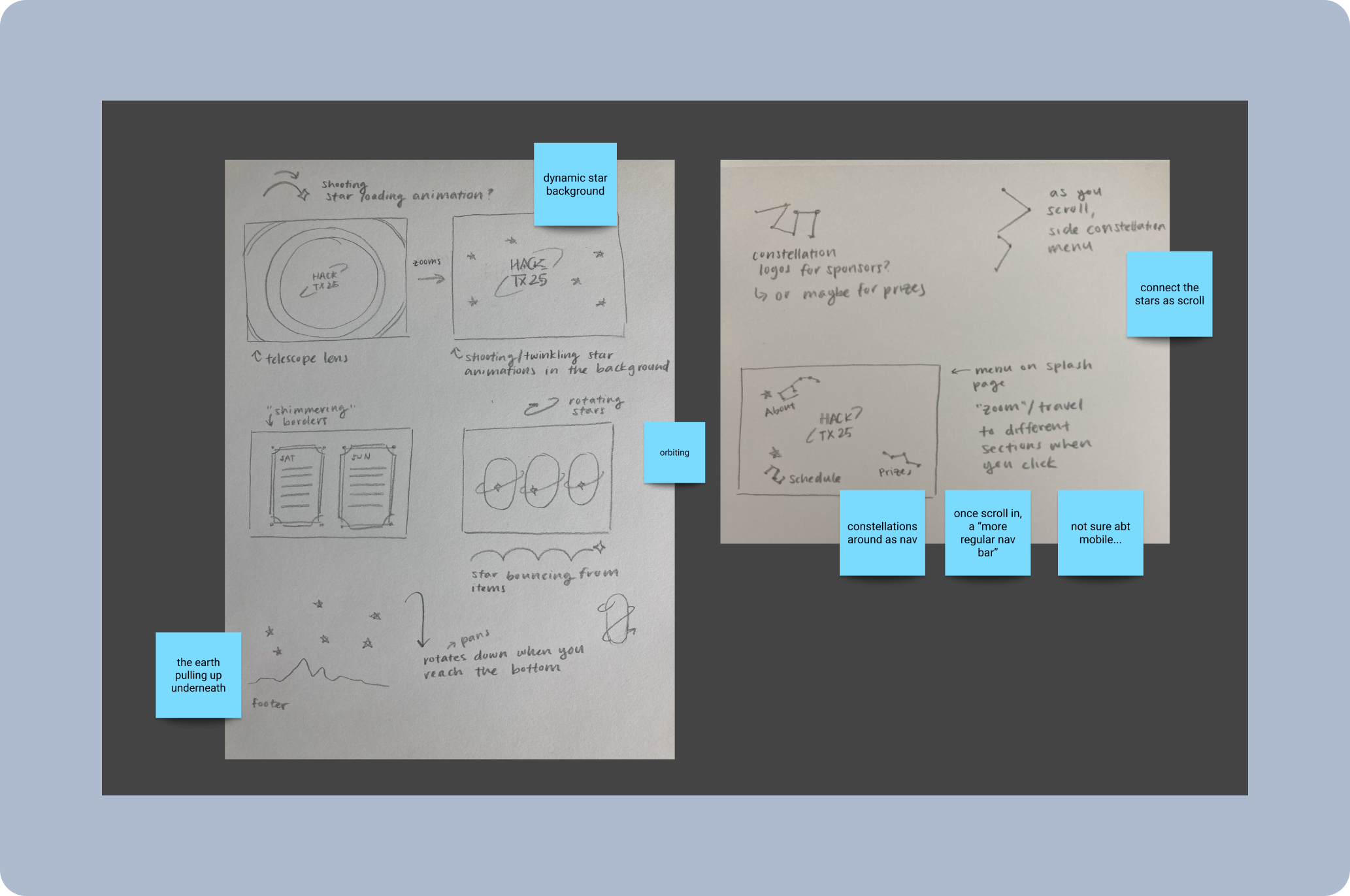 We then translated our ideas into sketches and low-fidelity prototypes, experimenting with elements like shooting stars, ornate gold borders, constellations, and dynamic backgrounds. These early designs helped us explore the celestial theme and refine the visual and interactive direction before moving into higher-fidelity development.